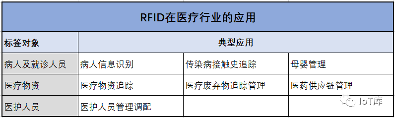 RFID在醫(yī)療行業(yè)的應(yīng)用非常豐富,針對不同的對象和場景,有如下表所示應(yīng)用: